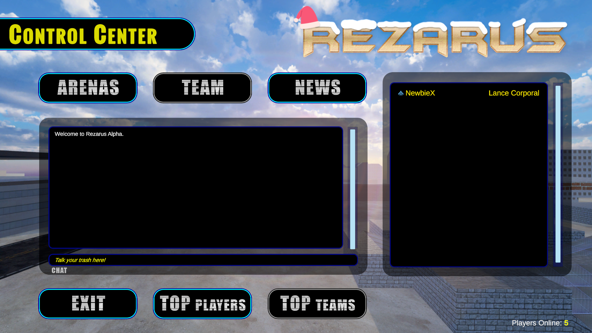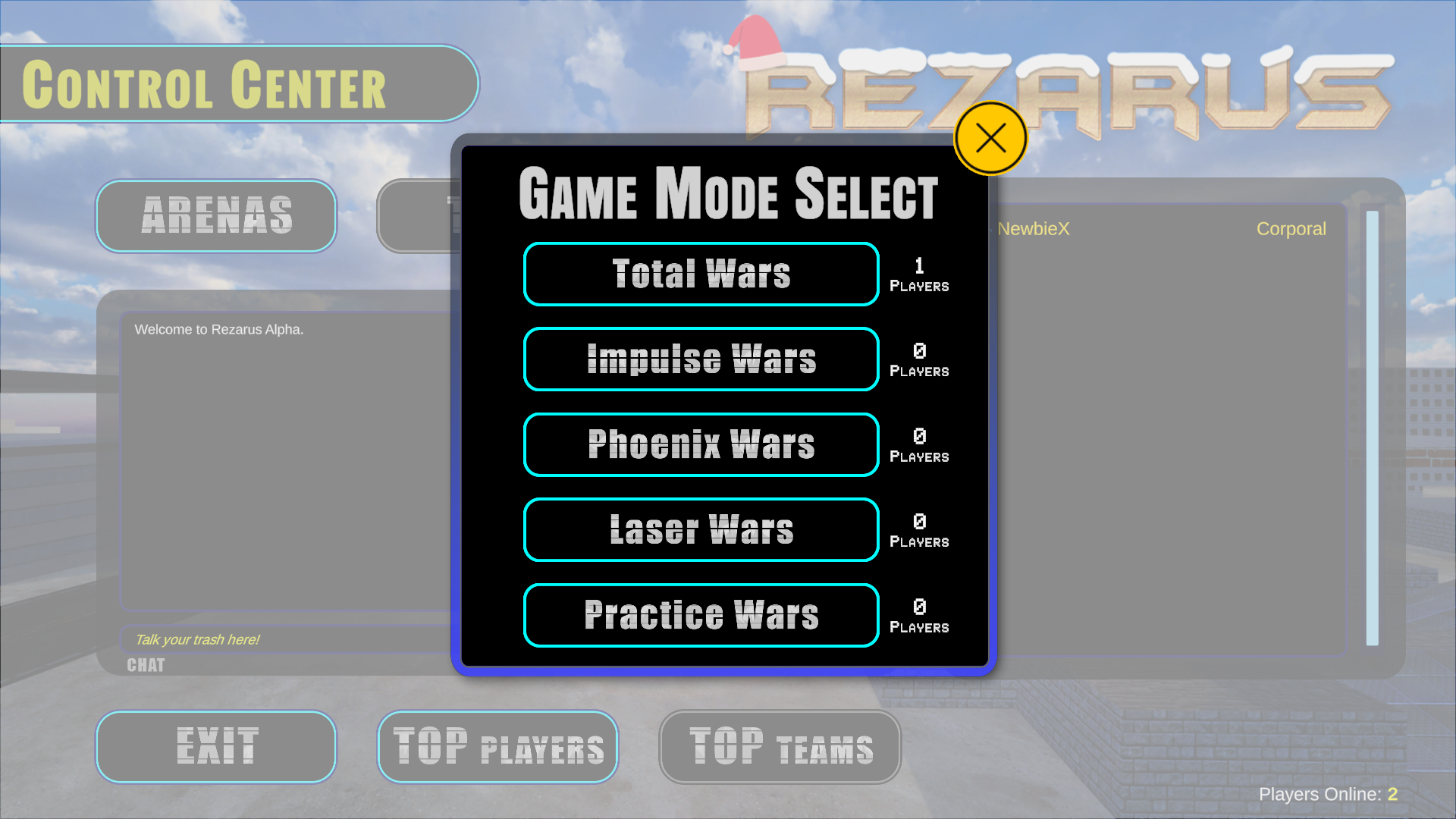 - When you first enter the game, you'll be in a chat room known as the Control Center. Just type to chat. At the top of the screen there are various buttons. Click the Arenas button. Select an arena type, then click OK to enter the arena. There are many types of arenas, but the basic three are Total Wars style, Impulse Wars, and Phoenix Wars. Within each of these categories exists a "Beginniner Mode" here your rank must be lower than a Lance Corporal (1,000,000 combined points from all game modes)– Review the Game Rankings.