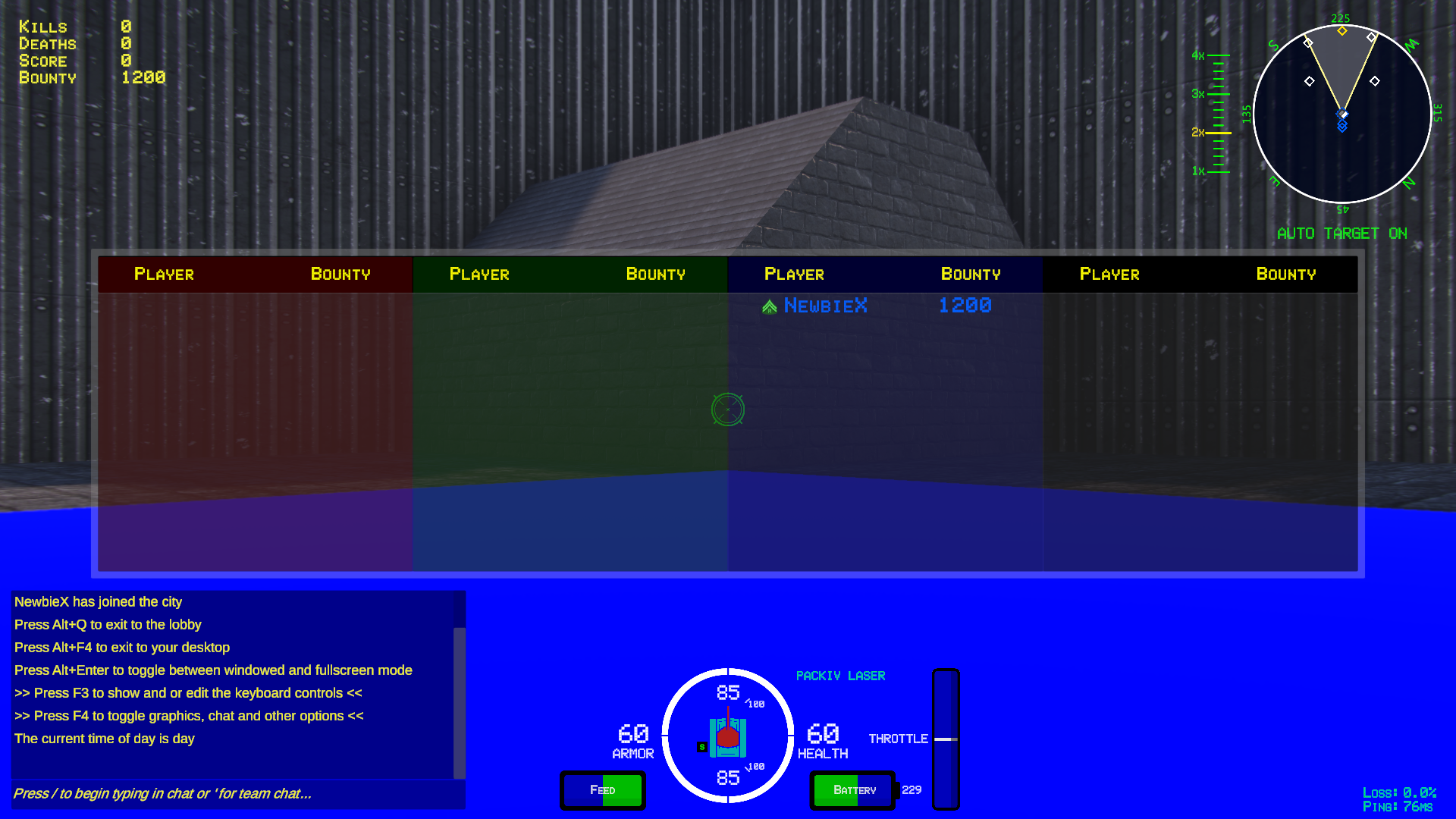 The key to getting good at the game, is by memorizing the keyboard config. Learning to operate the turret and tank movement simultaneously is the skill that will pay off the most, outside of learning to shift shields for Total Wars/Laser Wars. Check the screenshot for the current keyboard layout to get a feel for all the controls that are at your fingertips, or make changes to optimize the way you play.