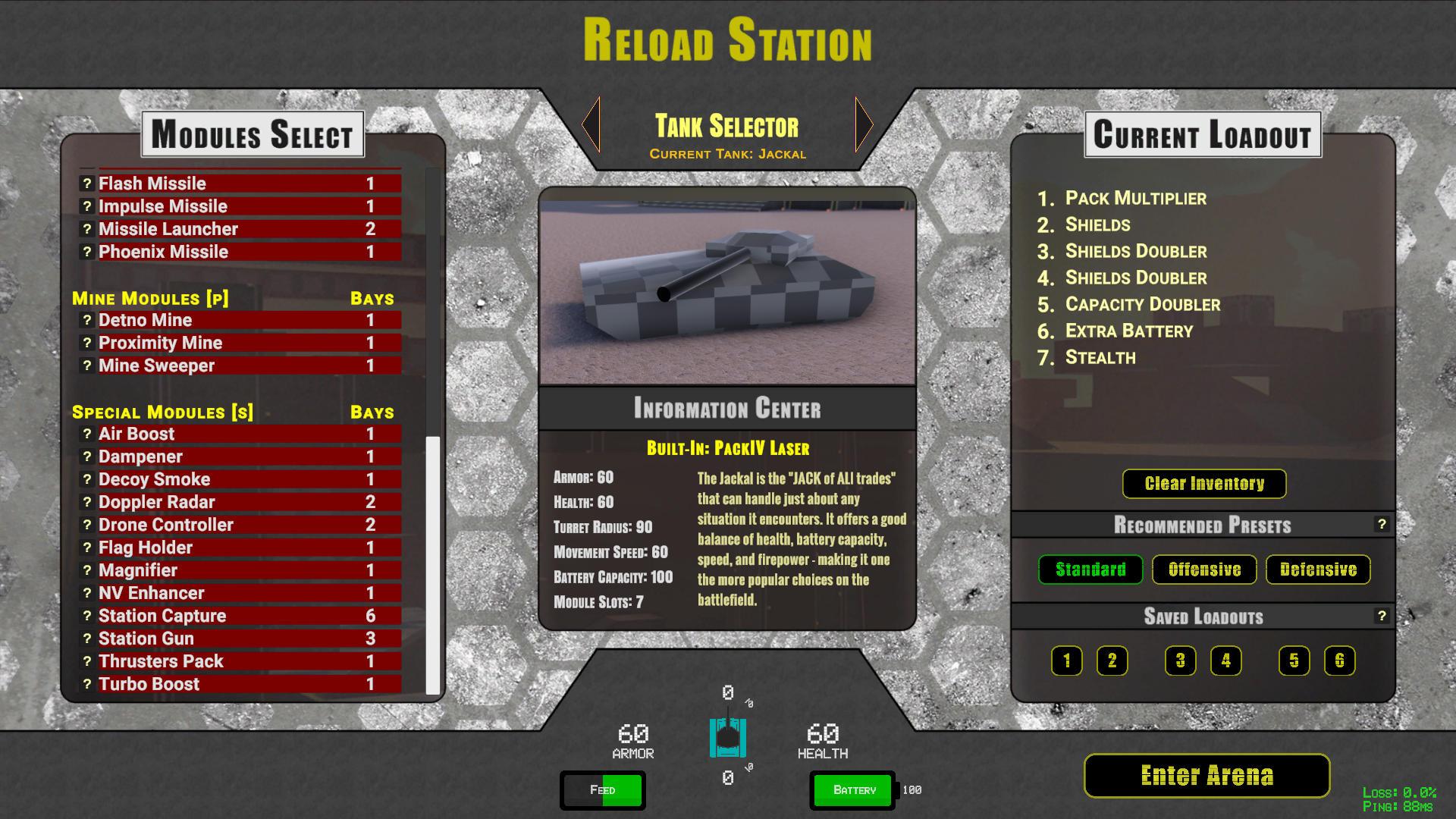 You are now at the Tank Selection screen. Near the screen's top center, choose a tank by clicking on the arrows on either side of the tank. Use the default weapons for now by pressing the Load Config button. Enter the city by clicking on Enter Arena button.- You are in your team's base. All tanks that are your color are on your team. Don't shoot them or you'll waste your power (friendly fire is currently not allowed in any game mode, so you will not be able to damage them). Stay with your team and shoot the enemies.